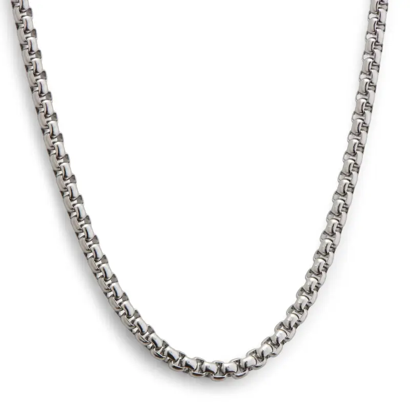 - This Silver-toned 3mm round cut box chain necklace offer Online Across Pakistan by Mart-ox.com is the perfect staple piece to every man’s jewellery collection. A Thin Round chain is the ultimate classic and the most popular chain type for men’s necklaces and other jewellery. The 3mm width suits perfectly for men who look for a subtle, Silver-toned necklace.