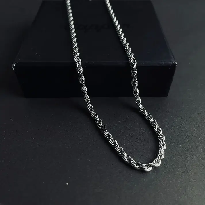 - This silver 5mm twist rope chain by Mart-Ox.com available online across Pakistan. this necklace looks perfect by itself or with a pendant. The simplistic Italian design of two strings infused together looks stunning with formal and casual outfits. This necklace also works as a great replacement for broken silver chain necklaces. The 5mm width suits perfectly for men who look for a delicate and timeless silver chain necklace.